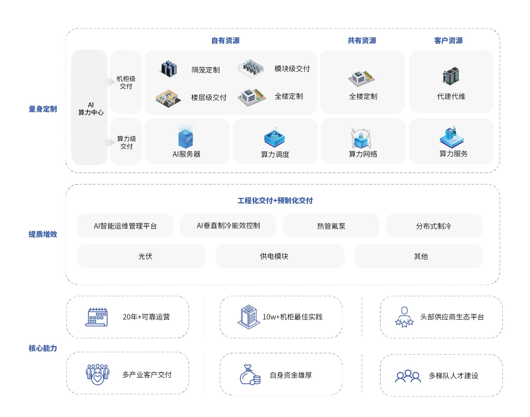 凭借资源整合、资金优势、专业建设能力和灵活高效的运营管理,我们与运营商携手合作,实现优势互补和资源共享,迅速为客户提供量身定制的算力基础设施。