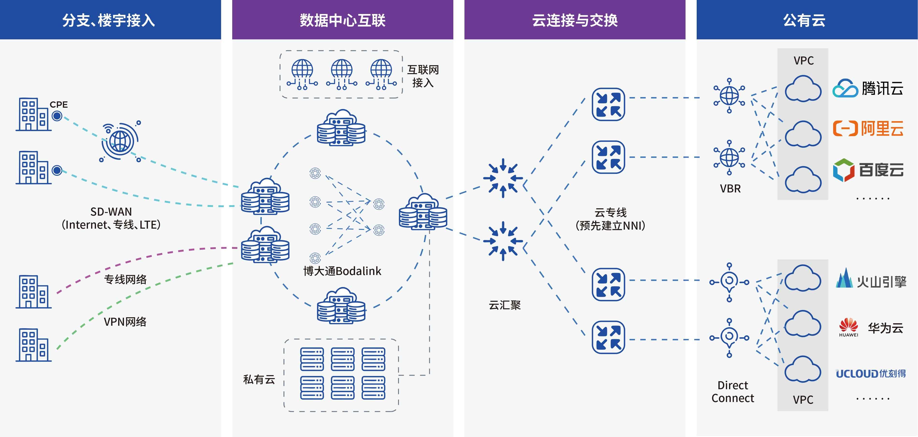 通过专线方式,实现数据中心高速互联互通,支撑跨地域业务数据流转与协同。